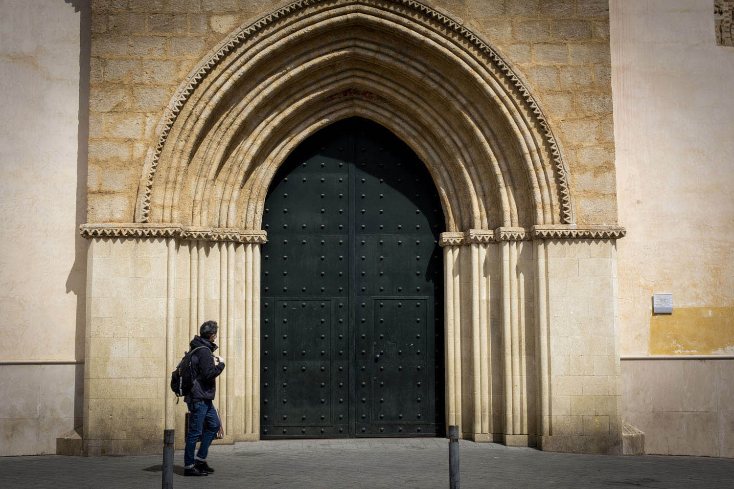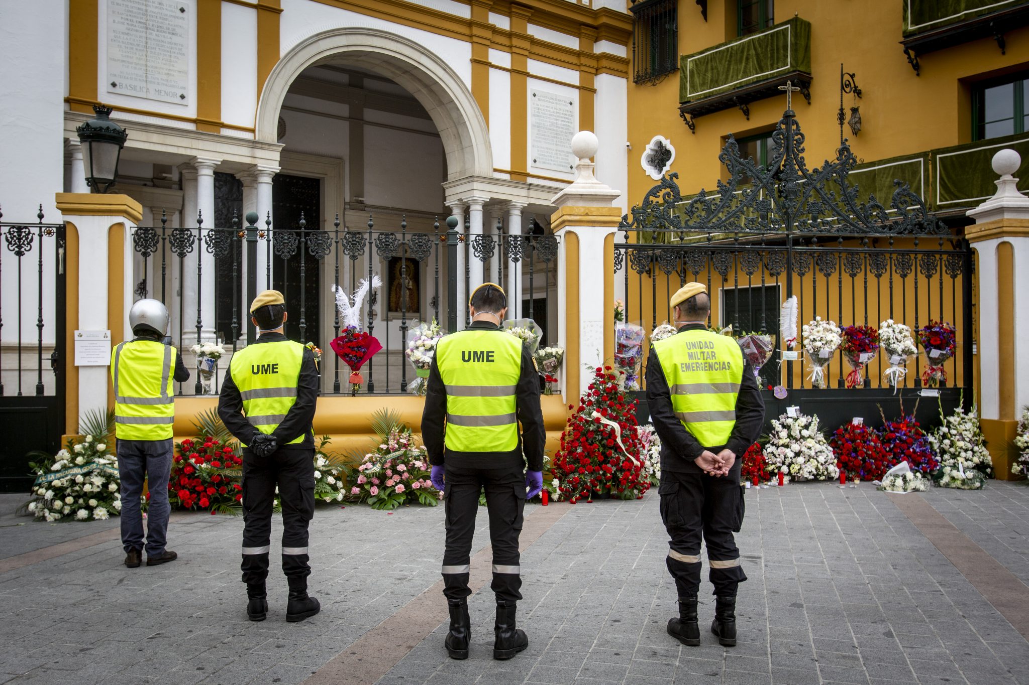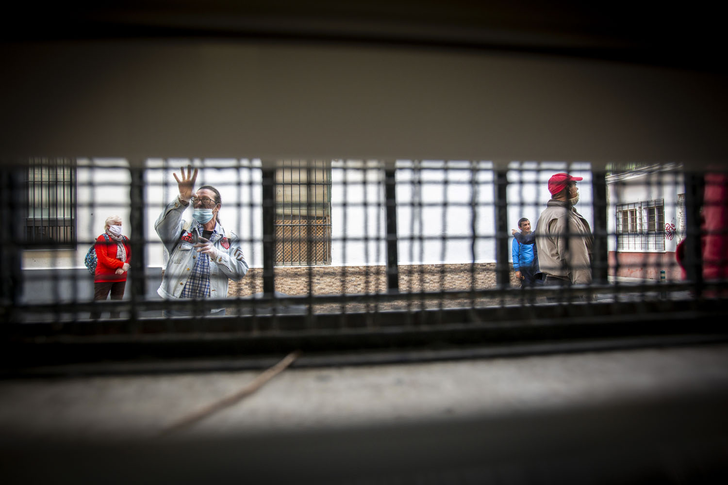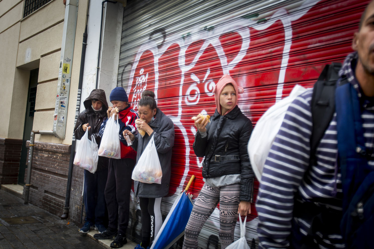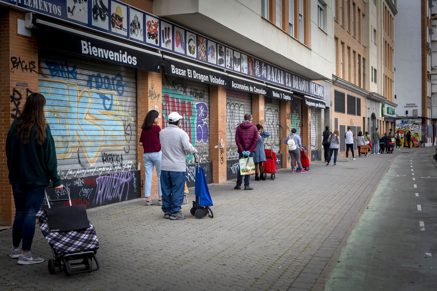 Un grupo de personas sin hogar esperan a las puertas del comedor social para recoger la ración que reparten las hermanas de la comunidad de San Vicente de Paúl en Sevilla.