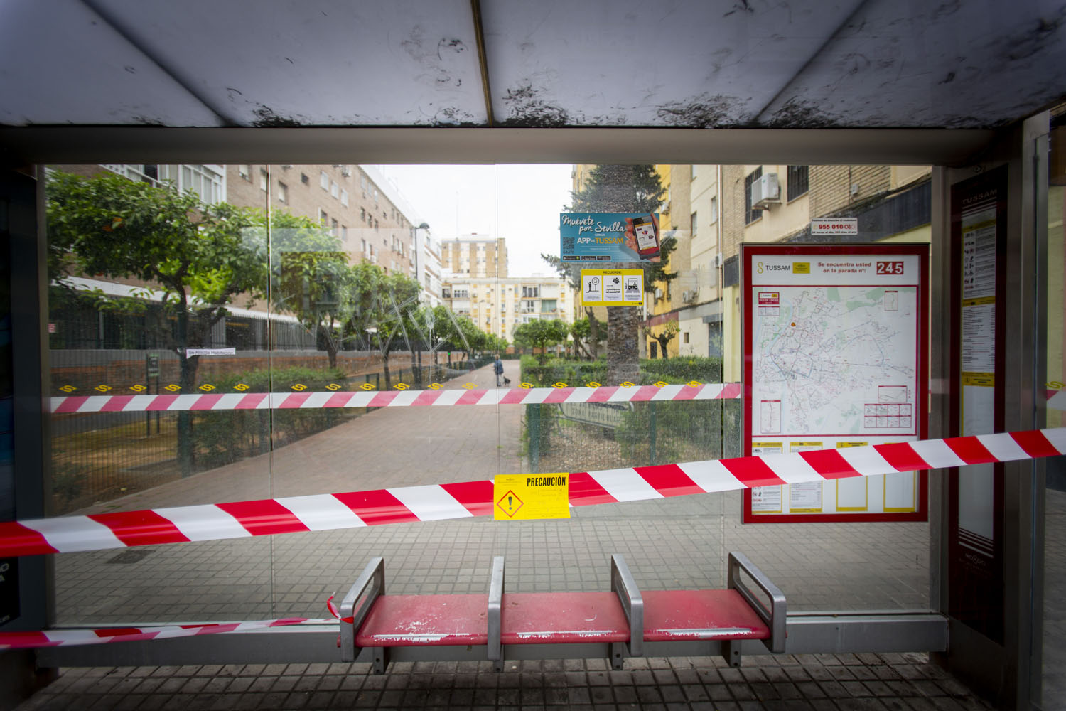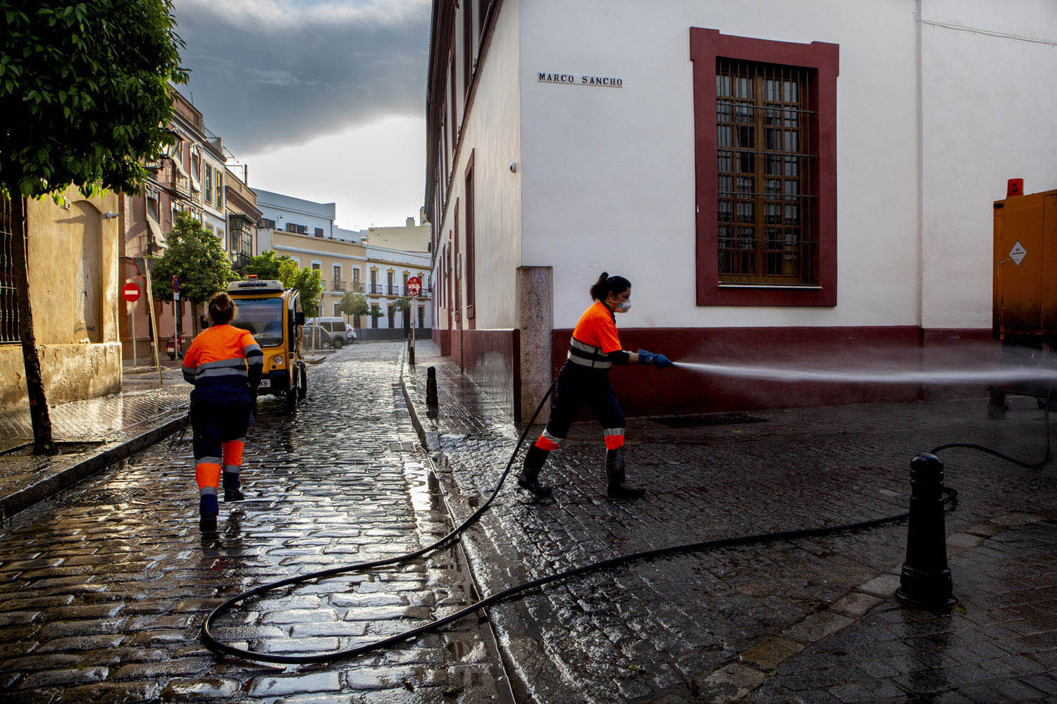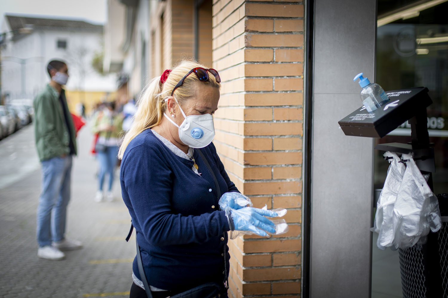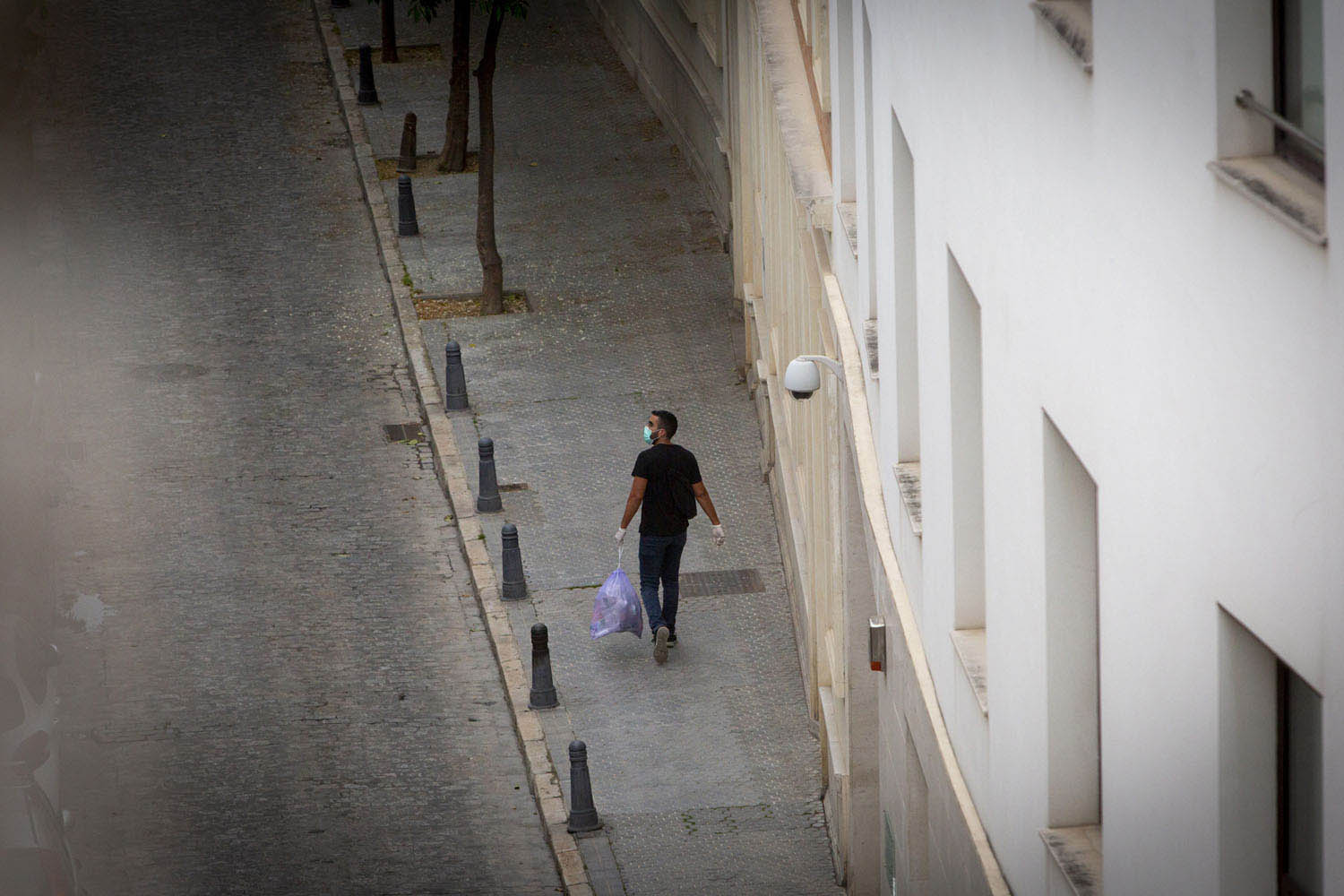 Un grupo de personas sin hogar esperan a las puertas del comedor social para recoger la ración que reparten las hermanas de la comunidad de San Vicente de Paúl en Sevilla.