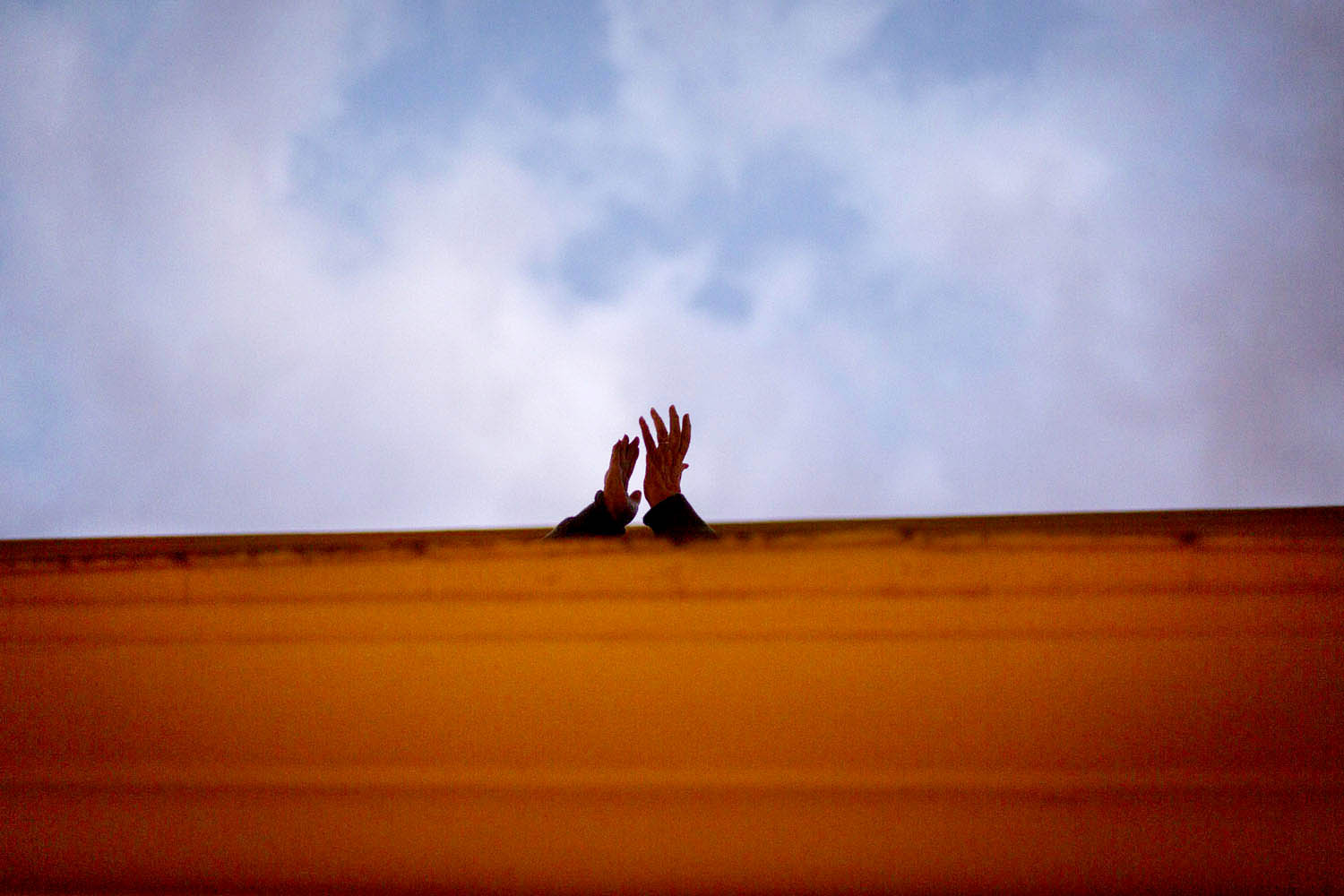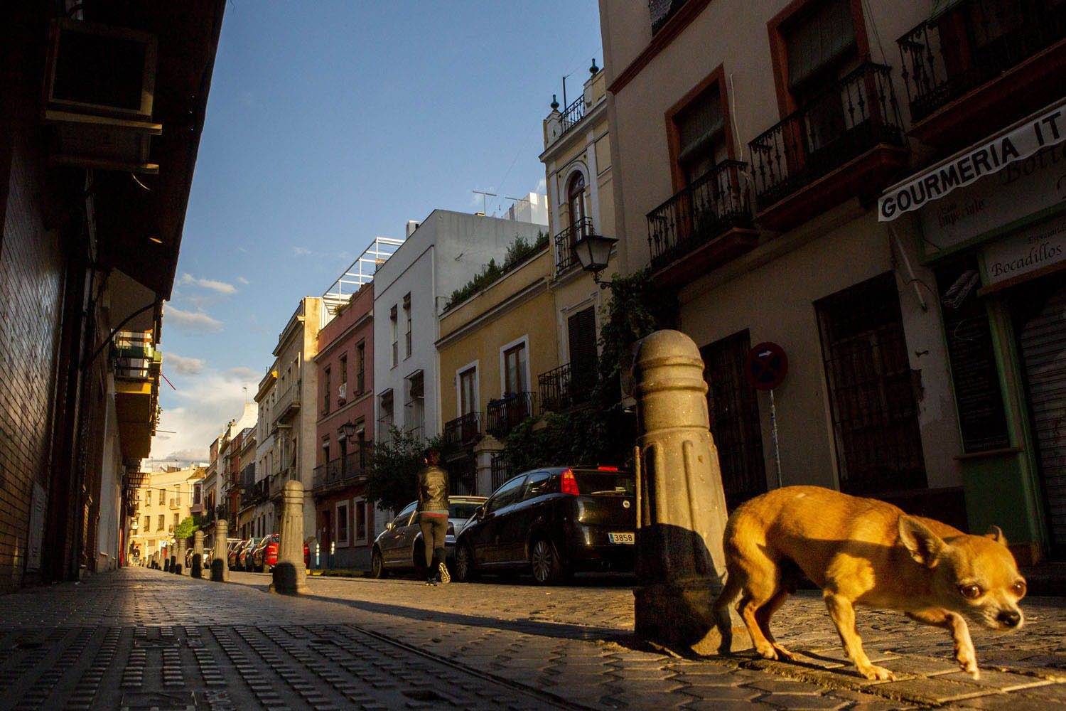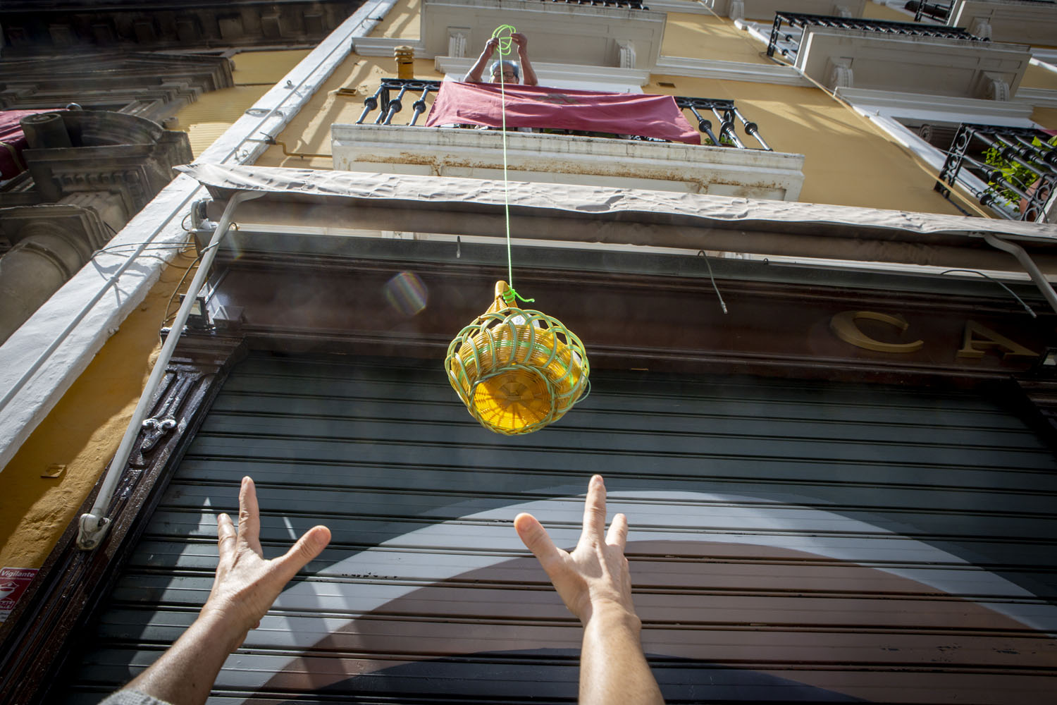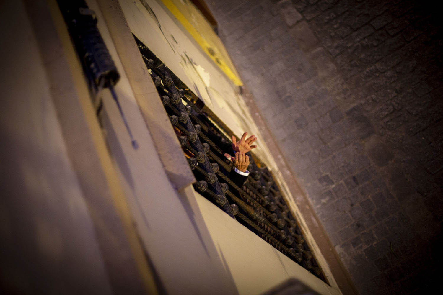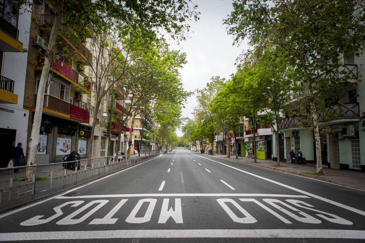 Un grupo de personas sin hogar esperan a las puertas del comedor social para recoger la ración que reparten las hermanas de la comunidad de San Vicente de Paúl en Sevilla.